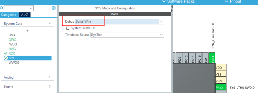 如图所示,将调试接口设置的设置为SW模式,占用芯片两个引脚。