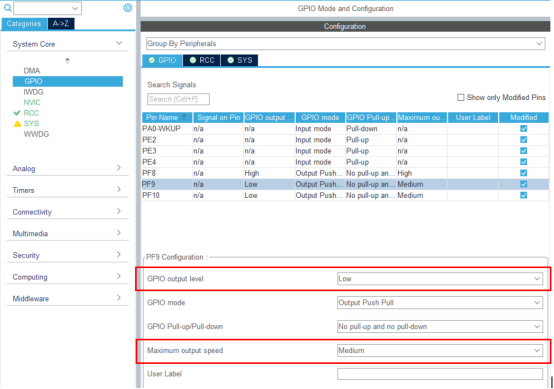 在输出配置中有GPIO输出电平,输出模式,上拉下拉,最高输出速率。由原理图可知LED灯的输出电平设置为低时则接上就会亮,而蜂鸣器设置为低则会响。将GPIO模式都设置为推挽模式,由于蜂鸣器音调一般由PWM波频率控制,所以蜂鸣器的最高速率可以设置为高,LED则无要求。