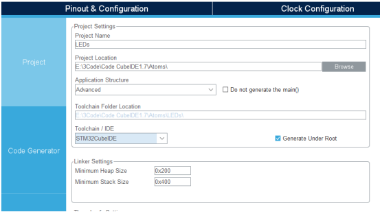 在ProjectManager中设置如如图所示,设置集成开发环境为STM32CubeIDE。运用其他平台比如IAR,Keil也可以对应选择。