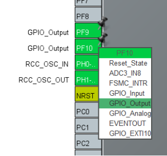 如图,在CubeMX中芯片的引脚中点击鼠标左键可以给引脚设置功能。