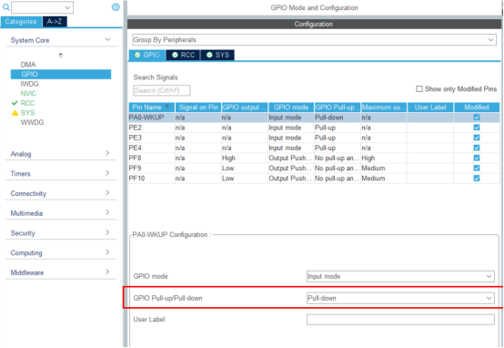 在GPIO工作模式设置中按如图所示设置,其中四个按键配置为输入模式之后需要设置上拉与下拉,由原理图可知,将PA0设置为下拉,其他为上拉。