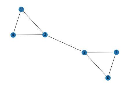 G.add_edges_from([[0, 1], [0, 2], [1, 2], [2,3], [3,4], [4,5], [3,5]])