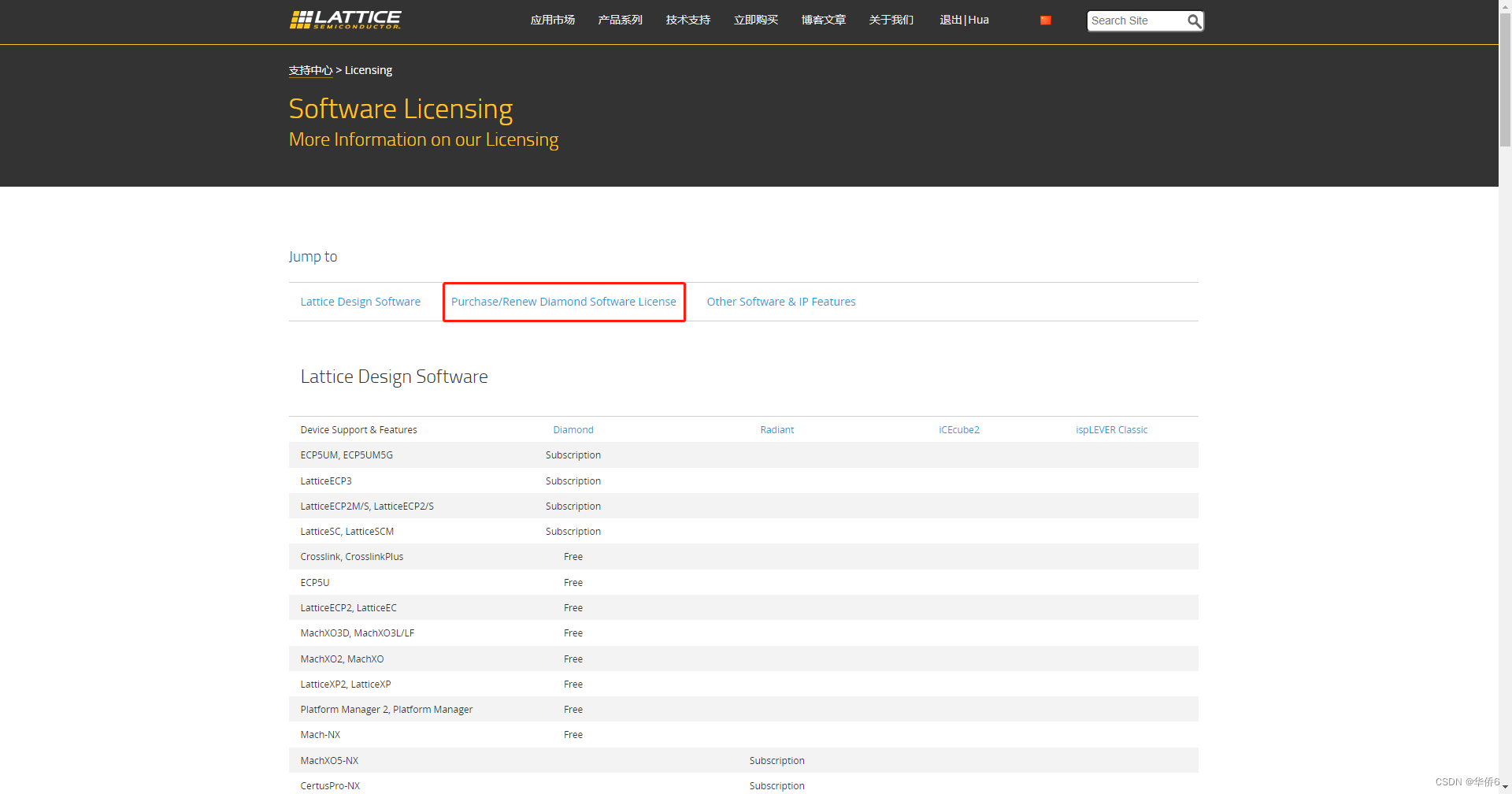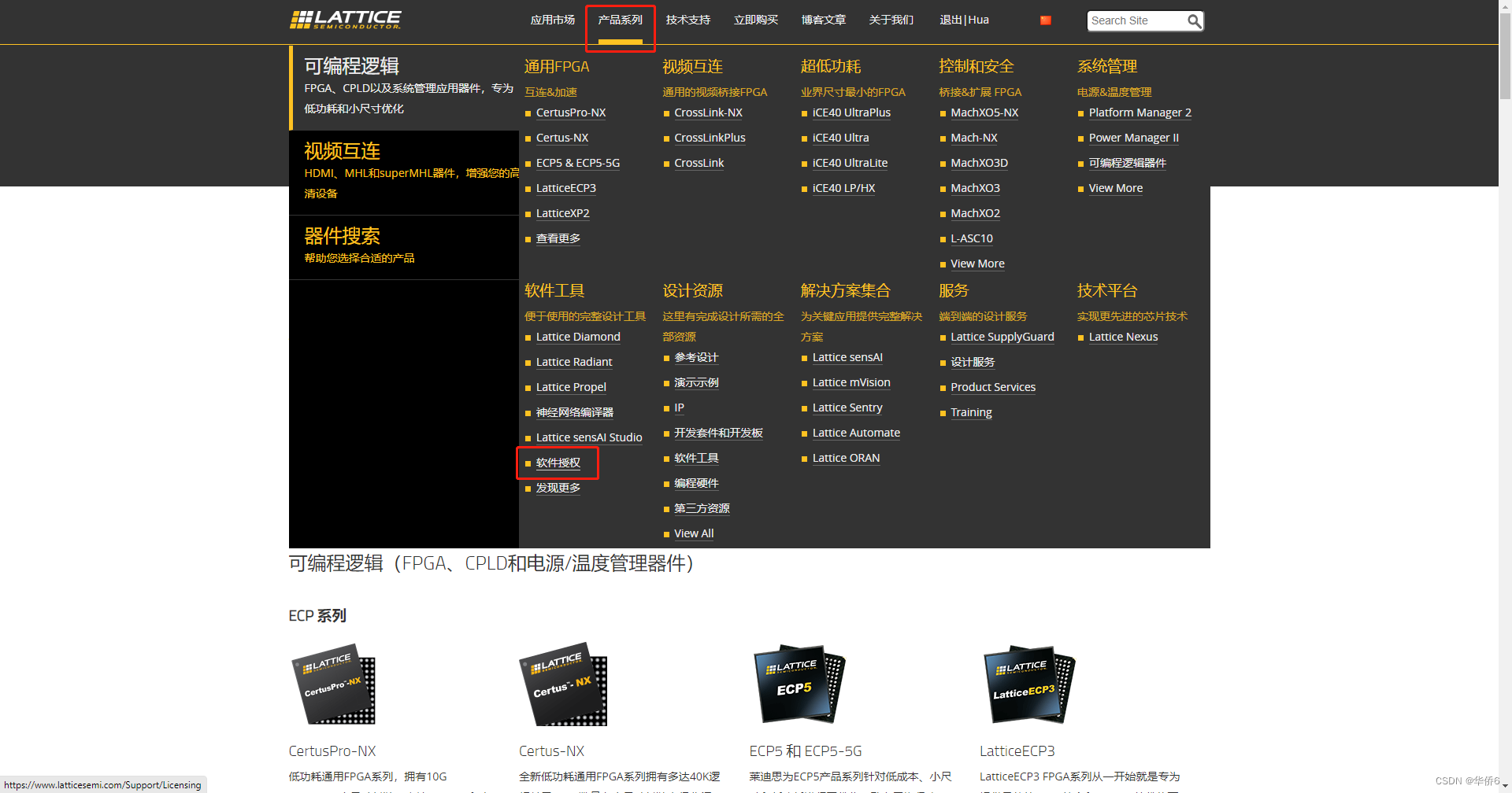 1.回到Lattice官网,选择进入产品系列下拉菜单中的软件授权界面;