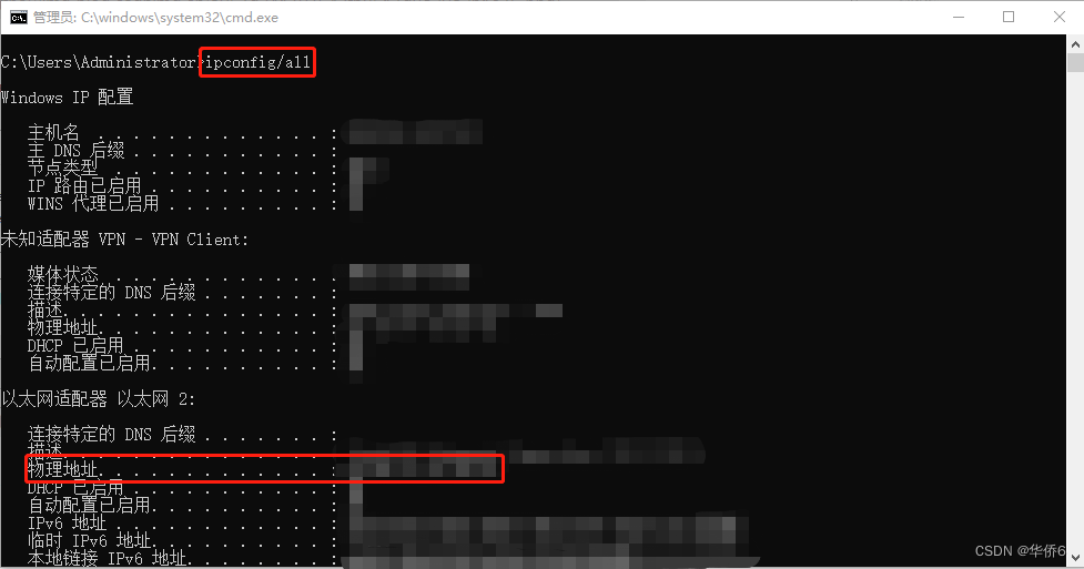 6.在弹出的命令框中输入 ipconfig/all,找到对应的物理地址。注意:这里复制的物理地址中间带有“-”,在填入时需要删掉,不然无法生成License;