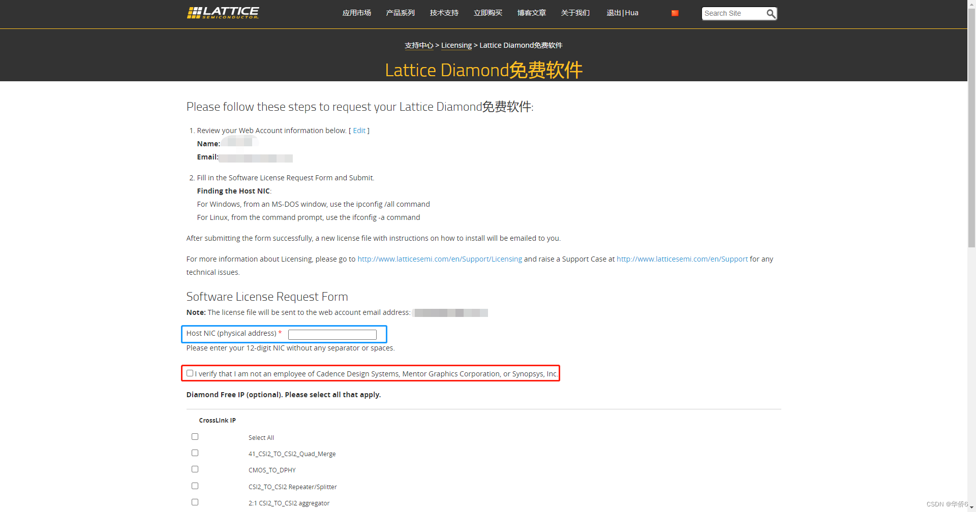 4.注册过Lattice Diamond账户的朋友将直接跳转到这个界面,在蓝色方框中填入电脑的物理地址,并勾选红色方框中的内容;