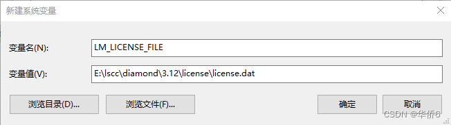 10.最后右击此电脑>属性>高级设置>环境变量>系统变量,如图所示:新建系统变量LM_LICENSE_FILE,为其指定license.dat的路径为:E:\lscc\diamond\3.12\license\license.dat,点击确定即可;