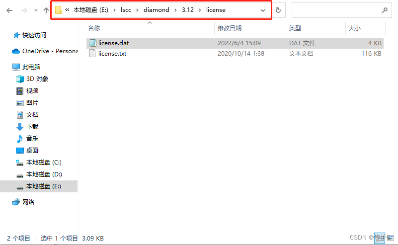 9.在邮箱中找到License.dat文件后,将其复制到如图中红框所示的安装路径下。注意:我的安装路径设置的是E:\lscc,朋友们可以根据自己设置的路径找到对应的license文件夹;