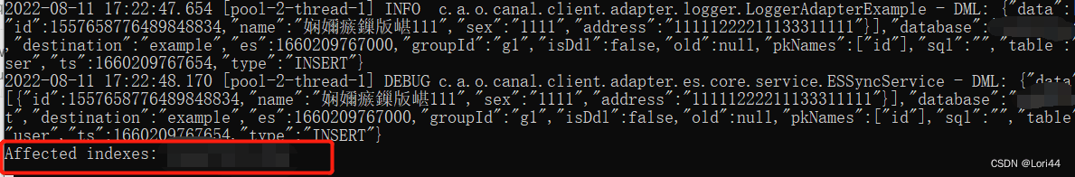 2:ccanal.adapter监听到日志: 如果出现 Affected indexes 则说明配置成功